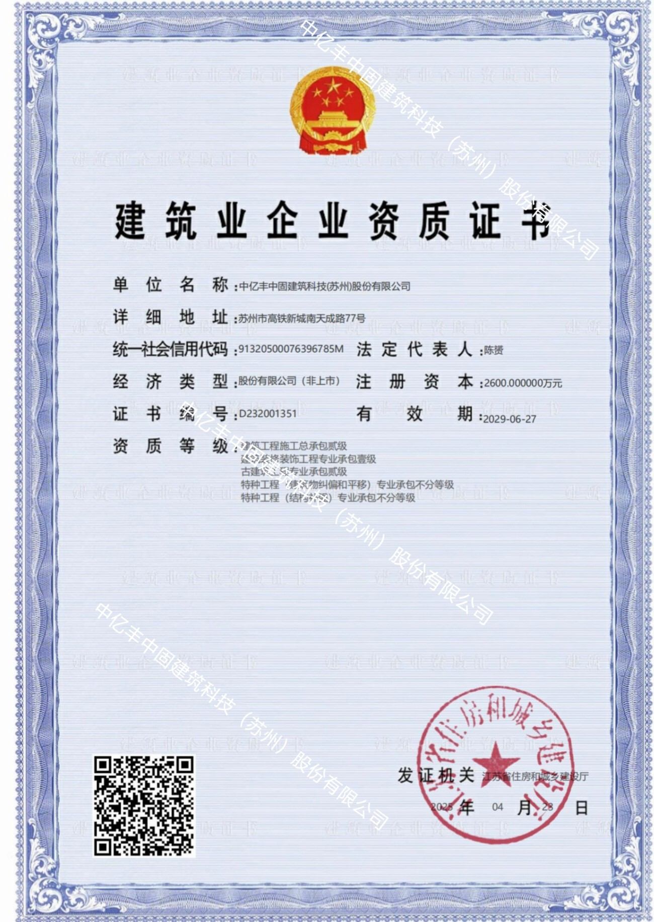 年初,中亿丰中固建筑科技(苏州)股份有限公司经江苏省住房和城乡建设厅严格审核,成功获批建筑装修装饰工程专业承包壹级资质,企业发展由此迈入全新阶段。
