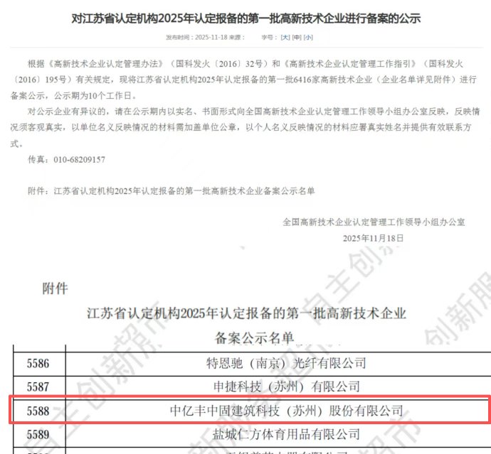 11月18日,全国高新技术企业认定管理工作领导小组办公室发布公示,中固建科第4次获得国家高新技术企业荣誉认定。