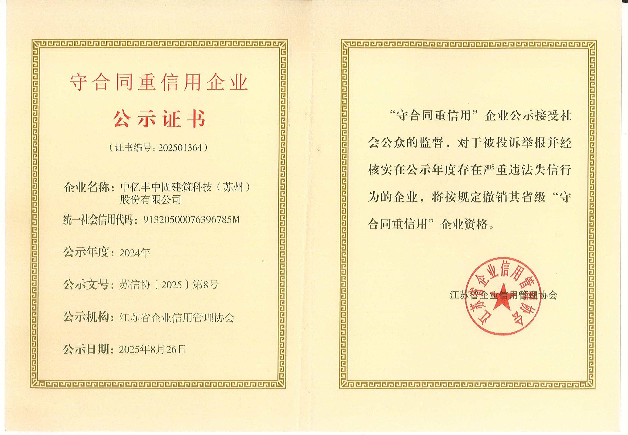 8月,江苏省市场监督管理局公布 2024 年度“守合同重信用企业”名单,中固建科凭借健全的合同信用管理体系、卓著的市场信誉及强劲的履约能力再次成功入选。