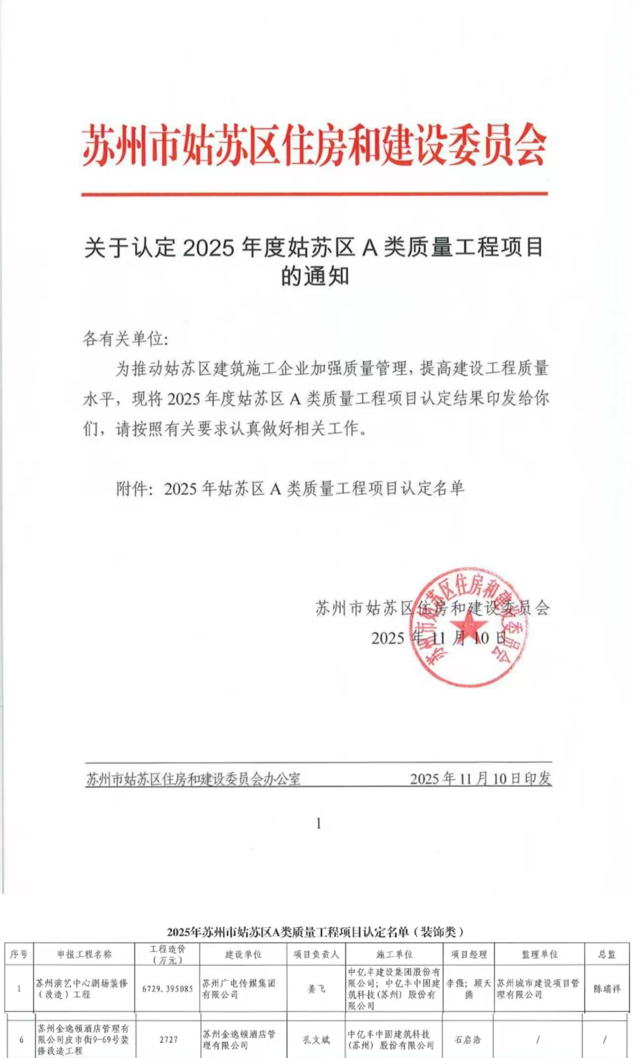 11月,公司承建的苏州演艺中心剧场改造工程、苏州金逸顿酒店管理有限公司皮市街9-69号改造工程成功入选苏州市姑苏区住房和建设委员会2025年度A类质量工程项目名单。
