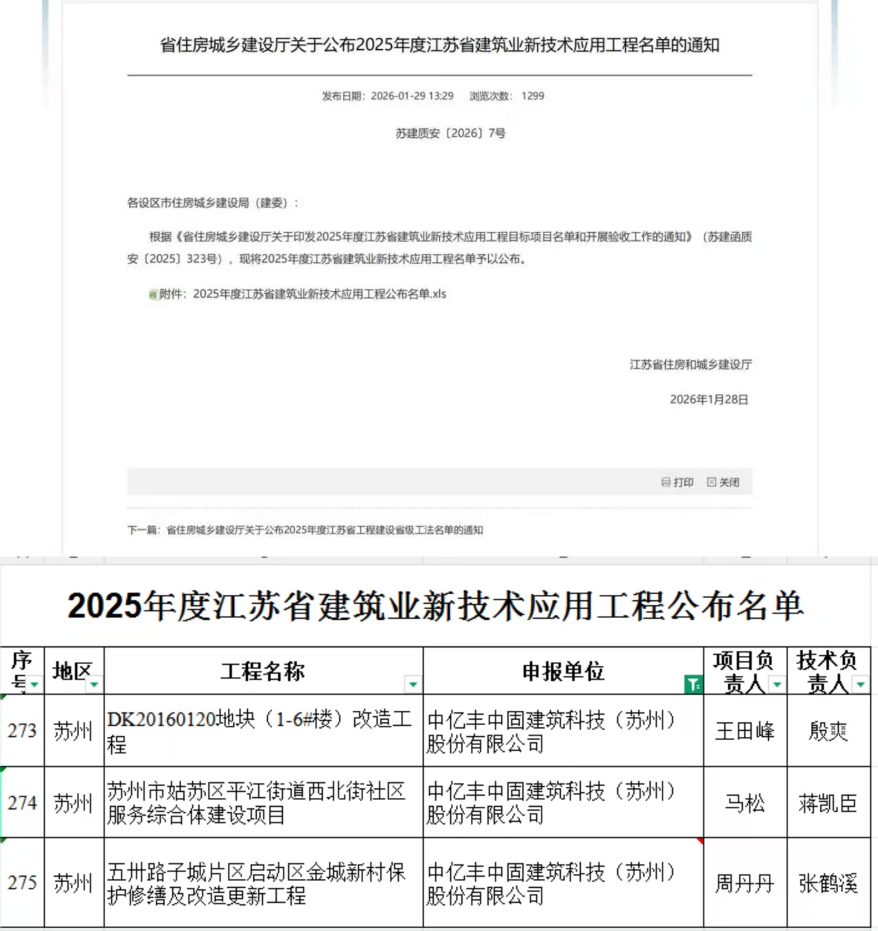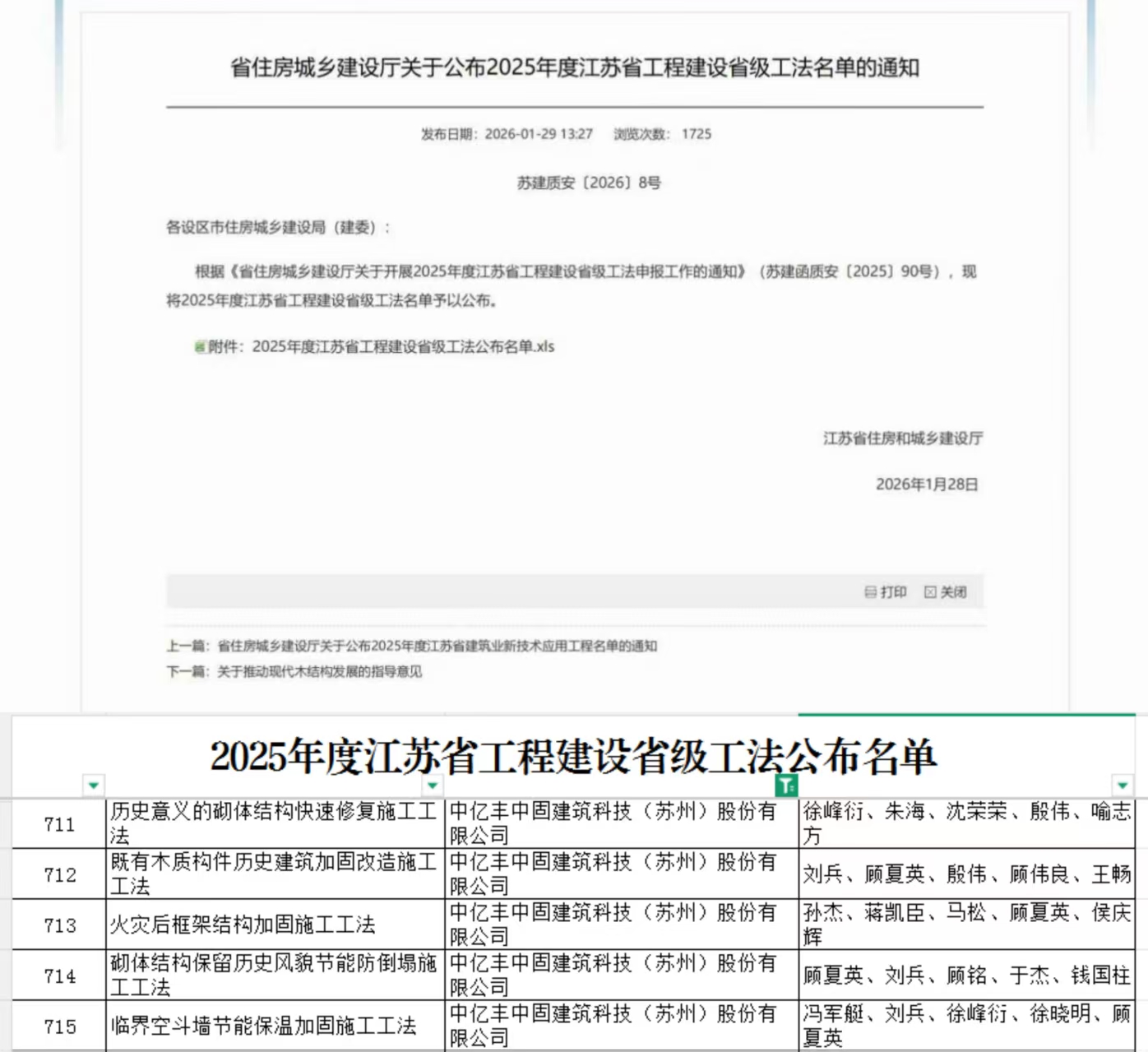 近日,江苏省住房和城乡建设厅正式公布2025年度省级工程建设工法及新技术应用示范工程评审结果,中固建科编制的五项施工工法荣获省级工法认证,承接的三项工程成功入选省级新技术应用示范工程,彰显了企业在历史建筑保护与城市更新领域的核心技术实力与行业标杆地位。
